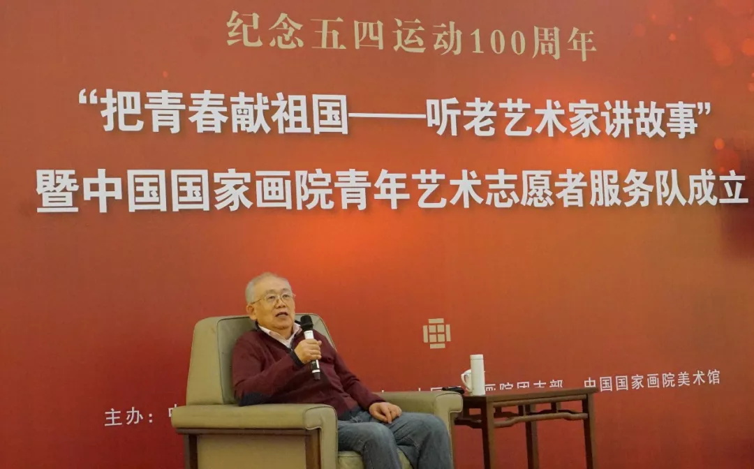 四月的北京,繁花似锦,生机盎然,处处呈现出春天的气息。4月28日,在中国国家画院美术馆的展厅内,一位白发苍苍的老者,手持话筒,安然端坐,目光炯炯有神,说话铿锵有力,他正在给台下一群年轻人诉说些什么。台下的观众时而微微点头体会老先生的话中真言;时而倾心一笑对老先生的讲话若有所思;时而引起一阵阵轻声讨论颇受启发。这是中国国家画院在五四青年节前夕举办的“把青春献祖国——听老艺术家讲故事”暨中国国家画院青年艺术志愿者服务队成立仪式的活动现场。这位老者便是中国国家画院的画家——李延声。