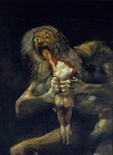 1808年拿破仑入侵西班牙后,他于1814年创作了《1808年5月2日(起义)》和《1808年5月3日(枪杀)》两幅油画,用色尖酸刻薄,一反其以前和谐的颜色。后来有画了许多关于战争、死亡、疾病的主题,他的画作《萨坦吞吃自己的孩子》简直是一幅噩梦,描绘的是希腊神话中萨坦为了防止自己的子女争夺神位,将孩子一个个吃掉的场面,但描绘的萨坦类似魔鬼,活灵活现地在吞噬一个成人。
