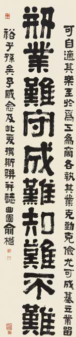 古人所谓:人生于天地间,以读书出仕为第弌能, 可显亲扬名,流传千古者;次则为农夫耕田,而食耕者,力也。田者,仓也,暇则品茶酌酒,亦可自适其乐。至于为工为商,各执其业。克勤克俭尤可成基立业,留裕子孙矣。予感念及此,爰撰斯联并志。曲园俞樾。