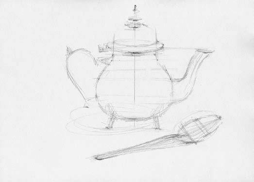 2. 最初的笔触用HB铅笔轻轻地涂画。陶壶的壶嘴被遮挡的部分,要用画椭圆的方法来画。画完这些之后,把花朵的形状添加上去。