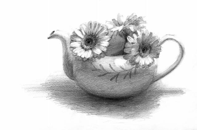 4. 陶壶的明暗、中间的反射光的笔触用HB铅笔轻轻地涂画。花的中心与陶壶同桌子的连接点用3B铅笔来完成。