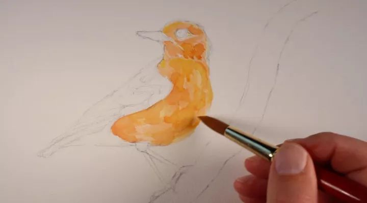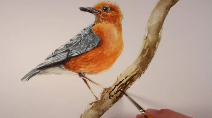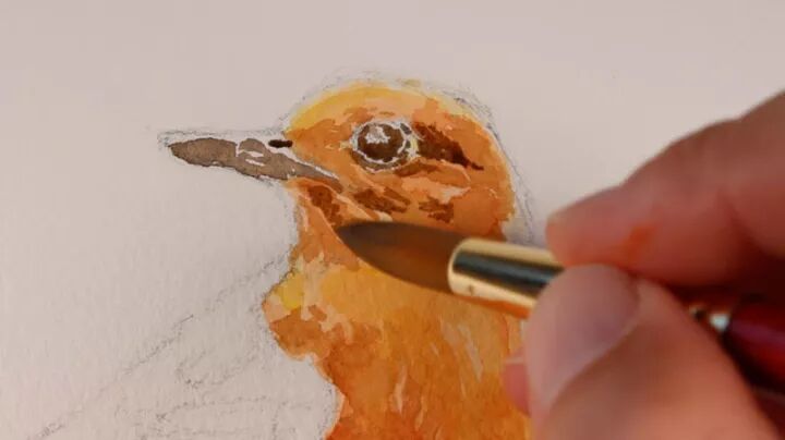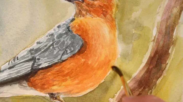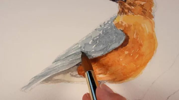 将赭石色和普鲁士蓝混合在一起,这一次,这种颜色被稀释并应用于鸟的尾部,以显示一点阴影。