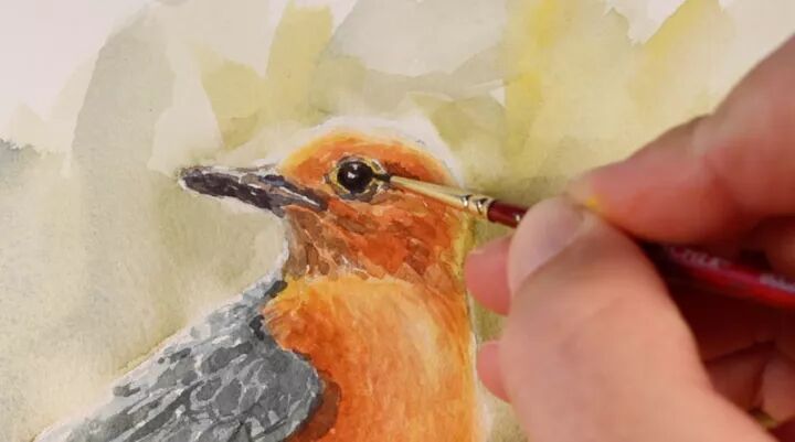 最后,用更强、更集中的普鲁士蓝和更小的笔刷将鸟的眼睛和喙表现出来。