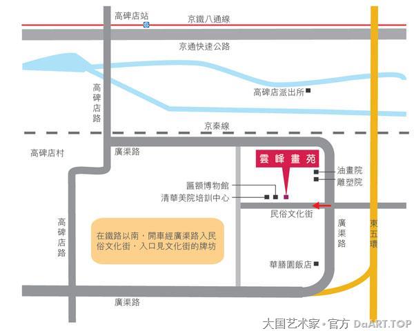 北京云峰画苑坐落于北京市朝阳区高碑店一带的文化新大街,附近为古色古香的艺术街道。近一千平米的展场设计独特、格调高雅。长期展出中国各地艺术家精品,同时为中外艺术家举办各类艺术展览活动,现成为北京最活跃的艺术机构之一。