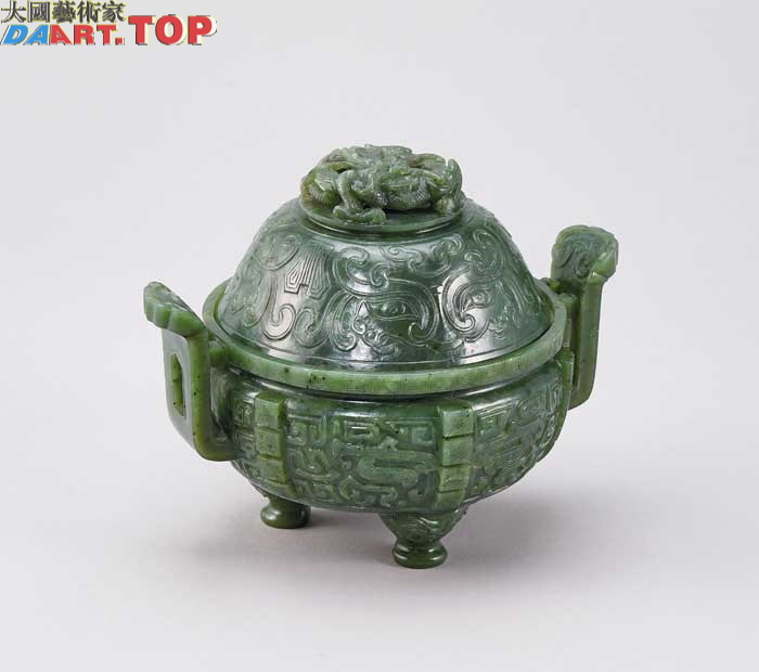清碧玉雕饕餮纹双耳三足龙钮盖炉