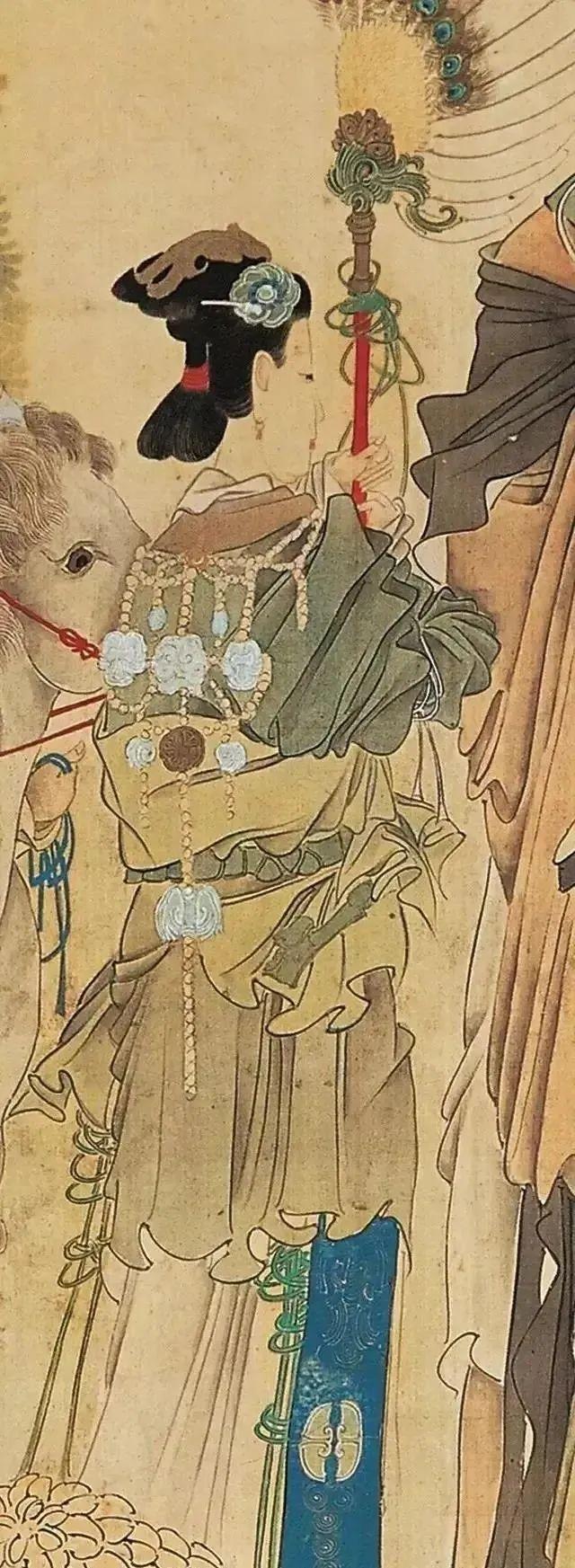 而人物画得古透浑厚,重彩大色,石青石绿的主调上,人物衣着五彩缤纷,仕女衣饰上勾着闪光的金色。