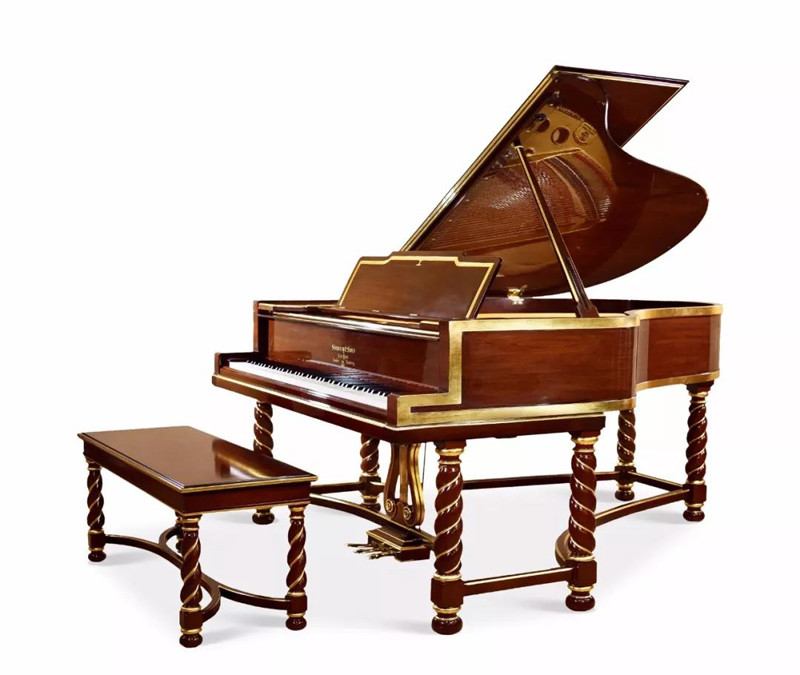 施坦威 英王詹姆士款 STEINWAY 铜鎏金非洲桃花心木小竖琴形状踏板钢琴 英国国王詹姆士一世款