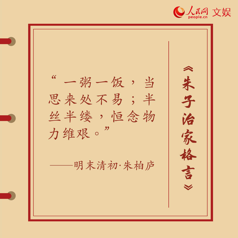 尊敬师长,勤俭持家,邻里和睦……《朱子治家格言》是明末清初理学家、教育家朱柏庐阐明修身治家之道的著作,是古往今来颇受尊崇的启蒙教材。文中,朱柏庐训诫晚辈要节约粮食,勤俭行事,“一粥一饭,当思来处不易;半丝半缕,恒念物力维艰”,更是广为引用的向俭名句。