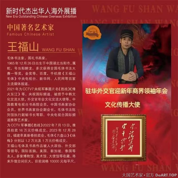 王福山,8341毛体书法家,央视国际推荐艺术家,国礼书画家,为CCTV军事题《胜战》每周日晚6点已播出50集,雅昌春季拍卖16万元。书100米毛体长卷在韶山毛主席铜像广场展示。与毛主席同日生同属蛇,2020年1226全国毛体书法家万人同日同庆我和主席生日。