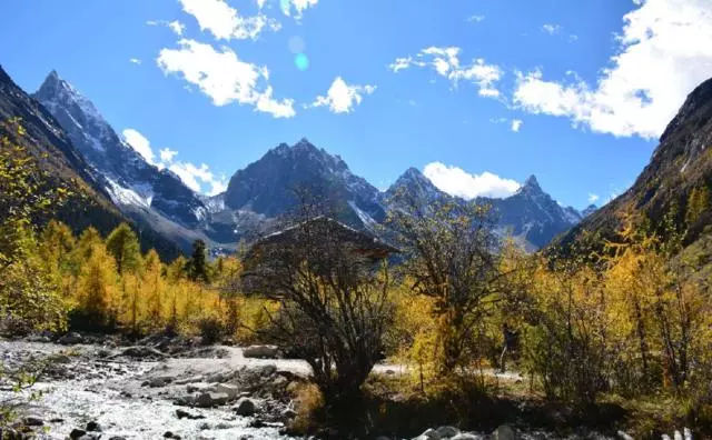 毕棚沟的蓝天下,溪水旁,秋意浓。