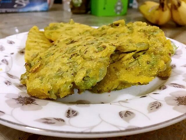 榆钱和玉米面、鸡蛋调成面糊,摊在锅里煎成小饼,两面金黄、外层酥脆内里香甜。