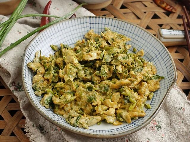 香椿跟鸡蛋是最佳伴侣,先用开水焯烫出香味,切末,鸡蛋打散,热锅宽油迅速翻炒,加点盐糖就起锅。