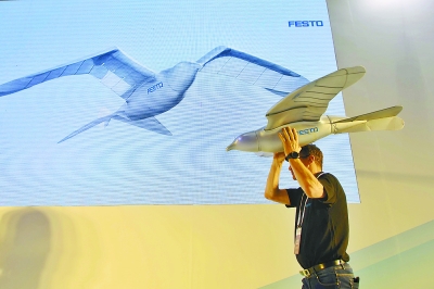 场馆内,仰头看着老鹰展翅雄姿,一名五六岁的小朋友忍不住“哇”地感叹:“这机器老鹰真拉风!”