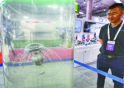 世界机器人大会上,仿生水母机器人在水箱中上下游动。记者 和冠欣摄