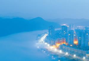 转下桥头,拐上沿江的路,继续在雾中行走一段,终于感觉到在雾中看雾的局限和尴尬。于是,返身回到临江的房间里,站在江雾之外,继续看江和江上的雾。宾馆九层楼的那个小小的窗户一推,就成为一个照相机的变焦镜头,倏地一下,就把眼前的新安江和两岸的景物“推远”,江与江上的雾、江与两岸的景物以及江的前世今生、来龙去脉,都尽收眼底——